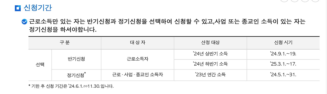 - 신청자는 반드시 근로소득, 사업소득, 종교인 소득이 있어야 하며 일정 기간 이상 근무해야 합니다.