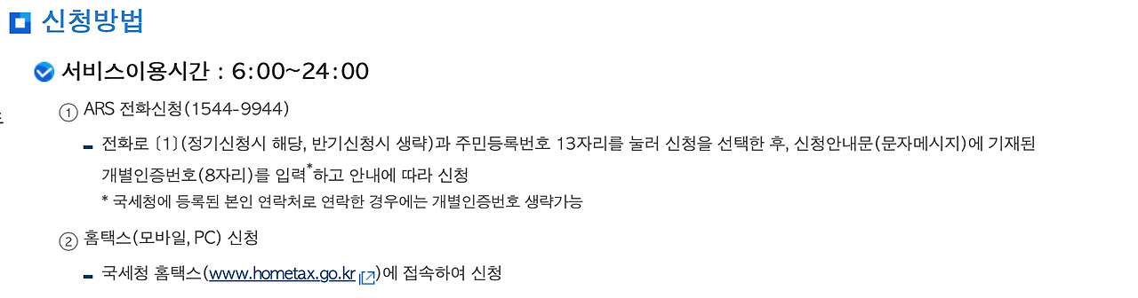 ✔ 사전 안내 문자를 받은 경우, 간단하게 ARS(1544-9944)나 홈택스로 신청 가능합니다.