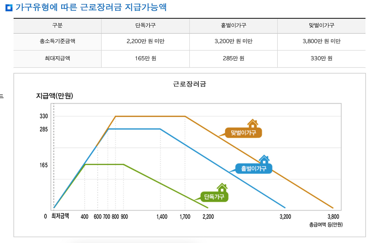 근로장려금 지급액은 가구 형태와 소득 수준에 따라 차등 지급됩니다.